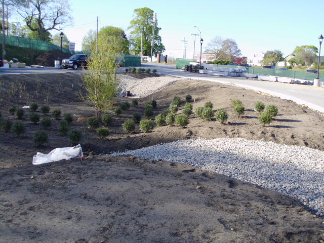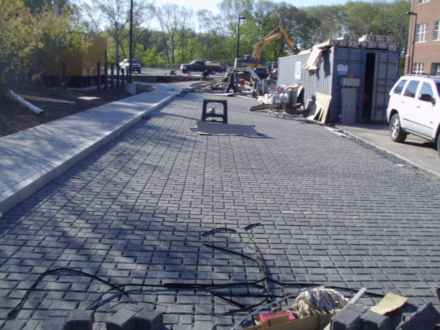 Pare was the site engineer for the New Plymouth North High School project. As part of the proposed improvements the following was designed; new vehicular and pedestrian access, associated parking, synthetic turf athletic fields and utilities. Tom Perry took a couple of construction photos while out on site. The construction photos show a bioretention area being installed where flush granite curb allows for roadway runoff to enter the bioretention area. The other photo shows some permeable pavers for select parking areas and overflow parking.