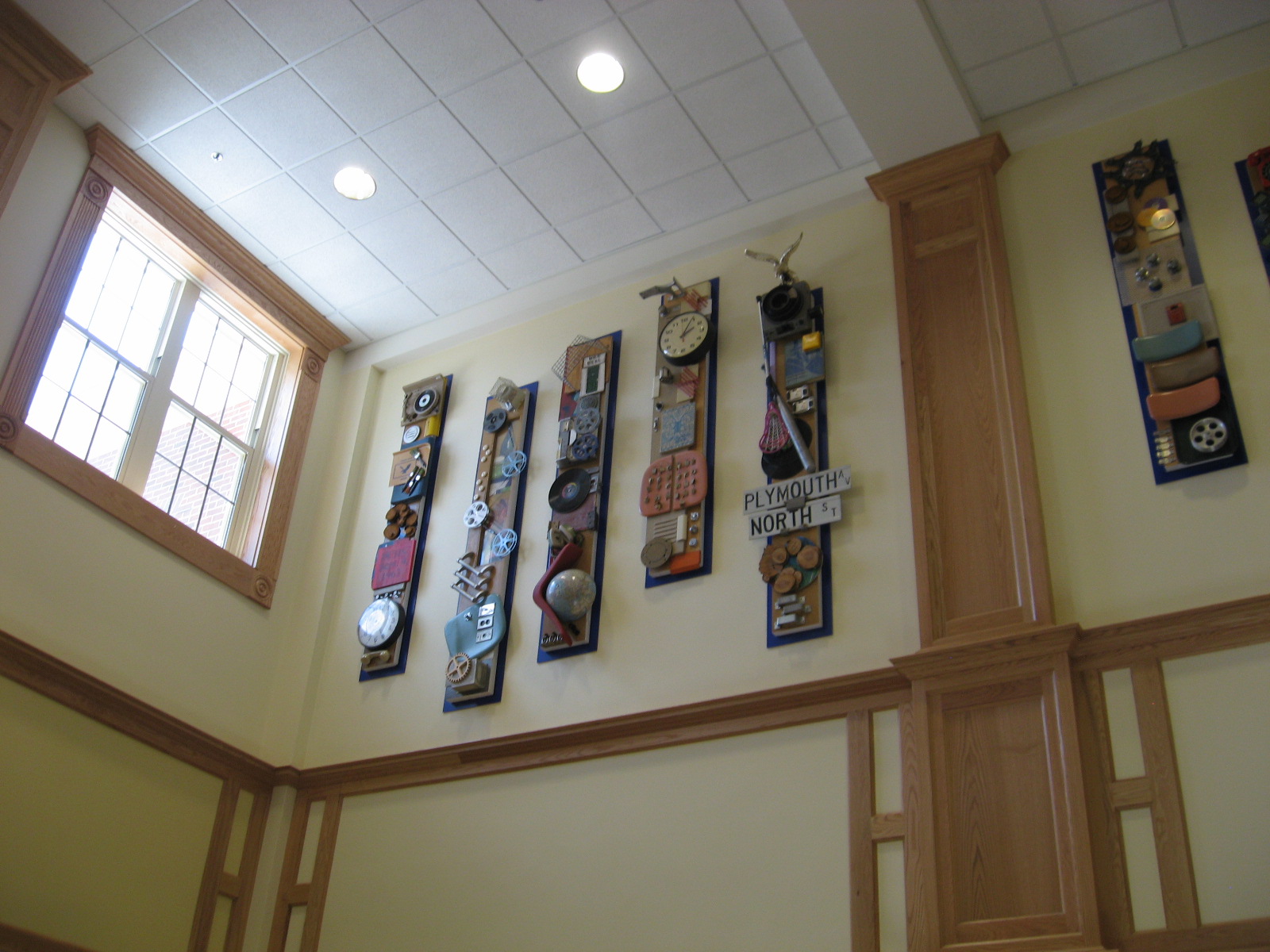 The gymnasium lobby features artwork made up of memorabilia from the former school.
