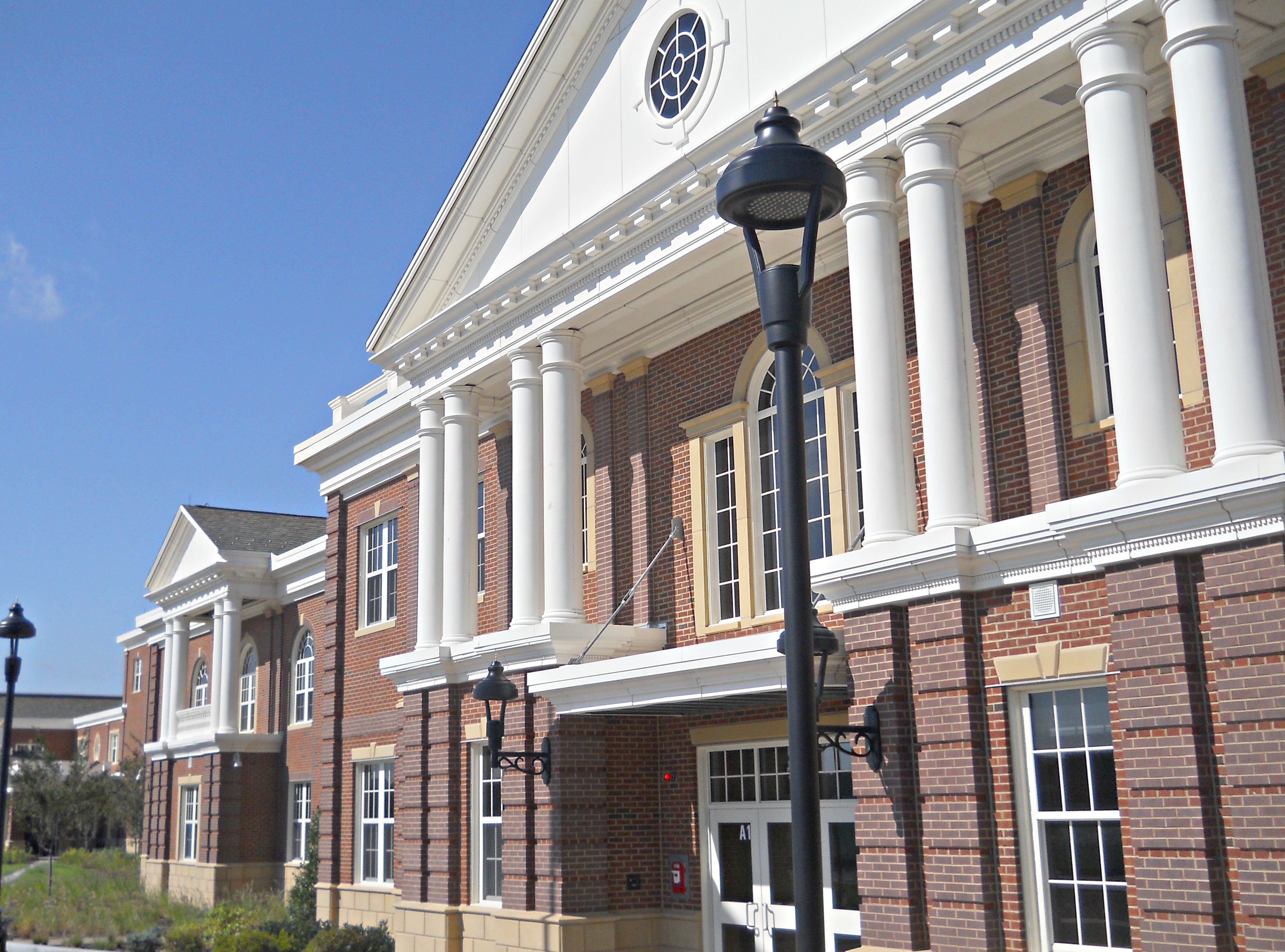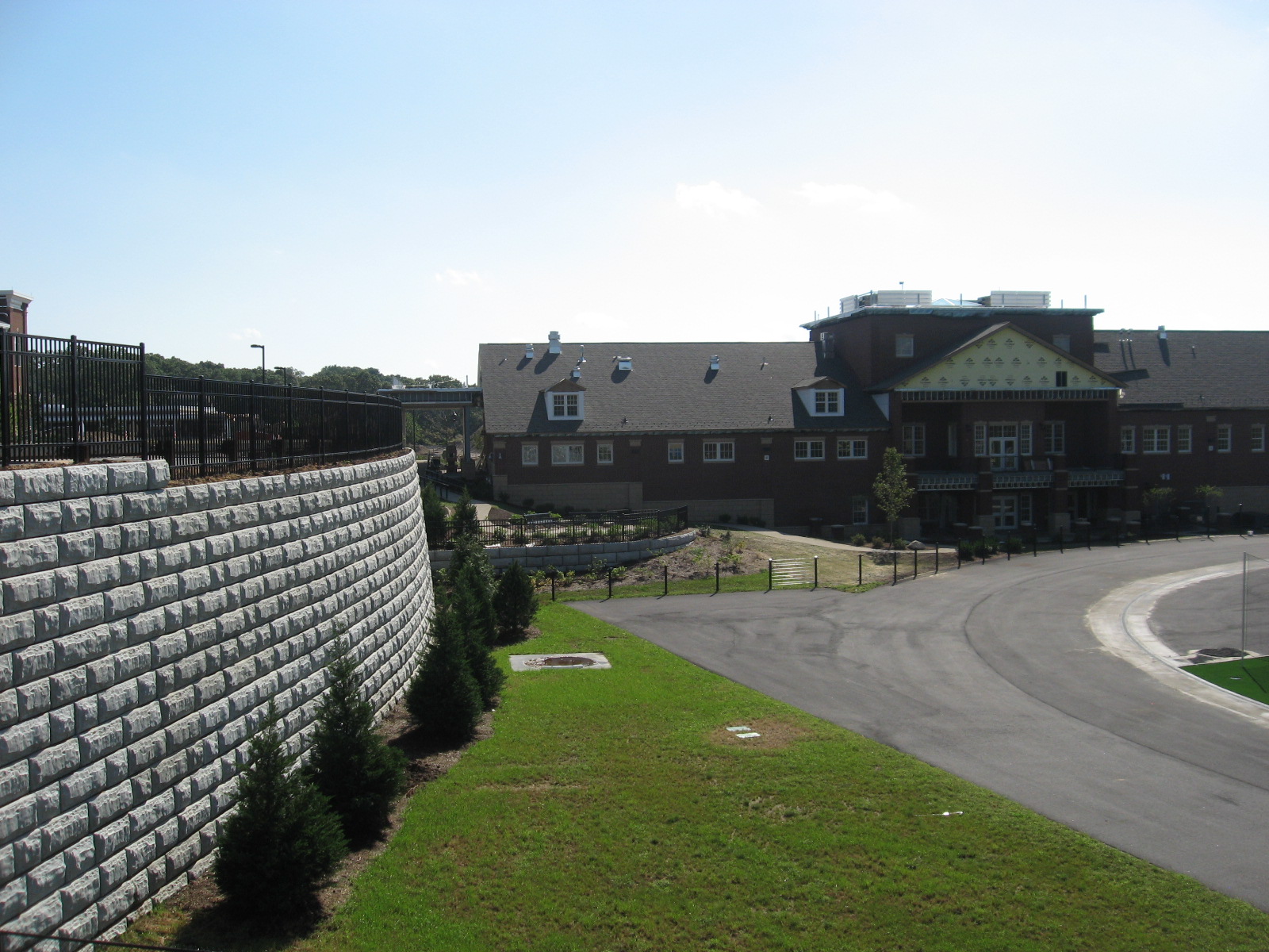 The school’s central courtyard is designed to maximize natural light to classrooms while providing an attractive outdoor space. River stone lining the building facilitates drainage and helps prevent moisture from being held against the building.