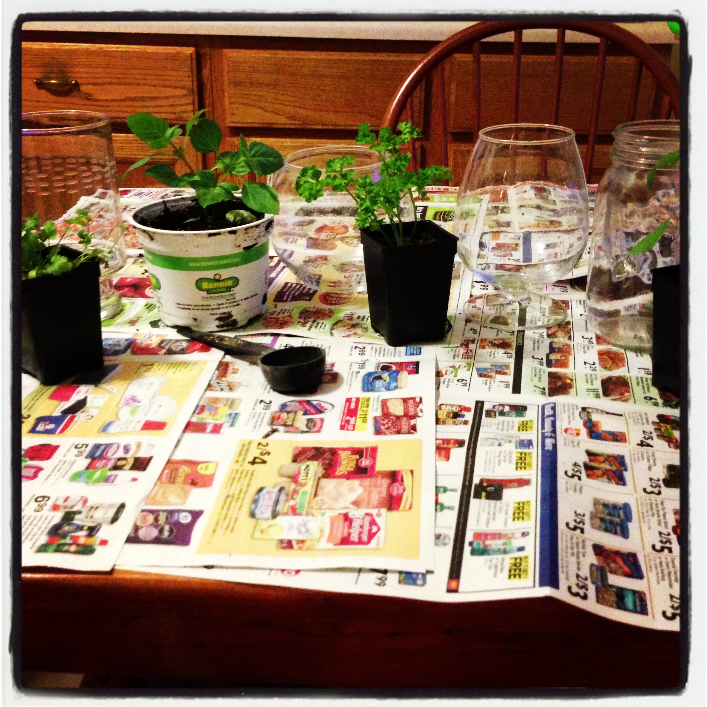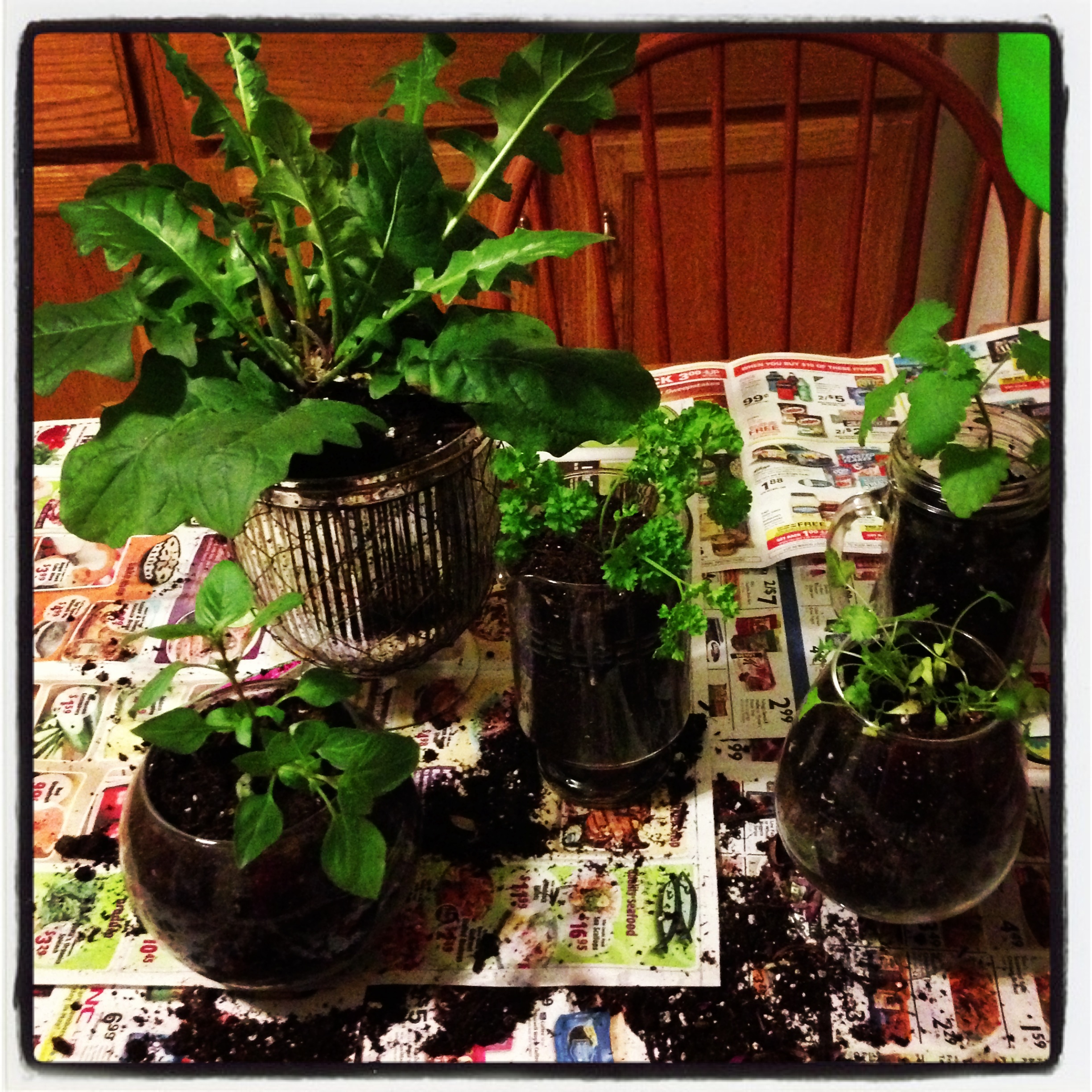 In order to finish the project, I did have to visit my local Savers (a store dedicated to reusing) and purchase two additional glasses for under $2.00. I also needed more potting soil than anticipated.