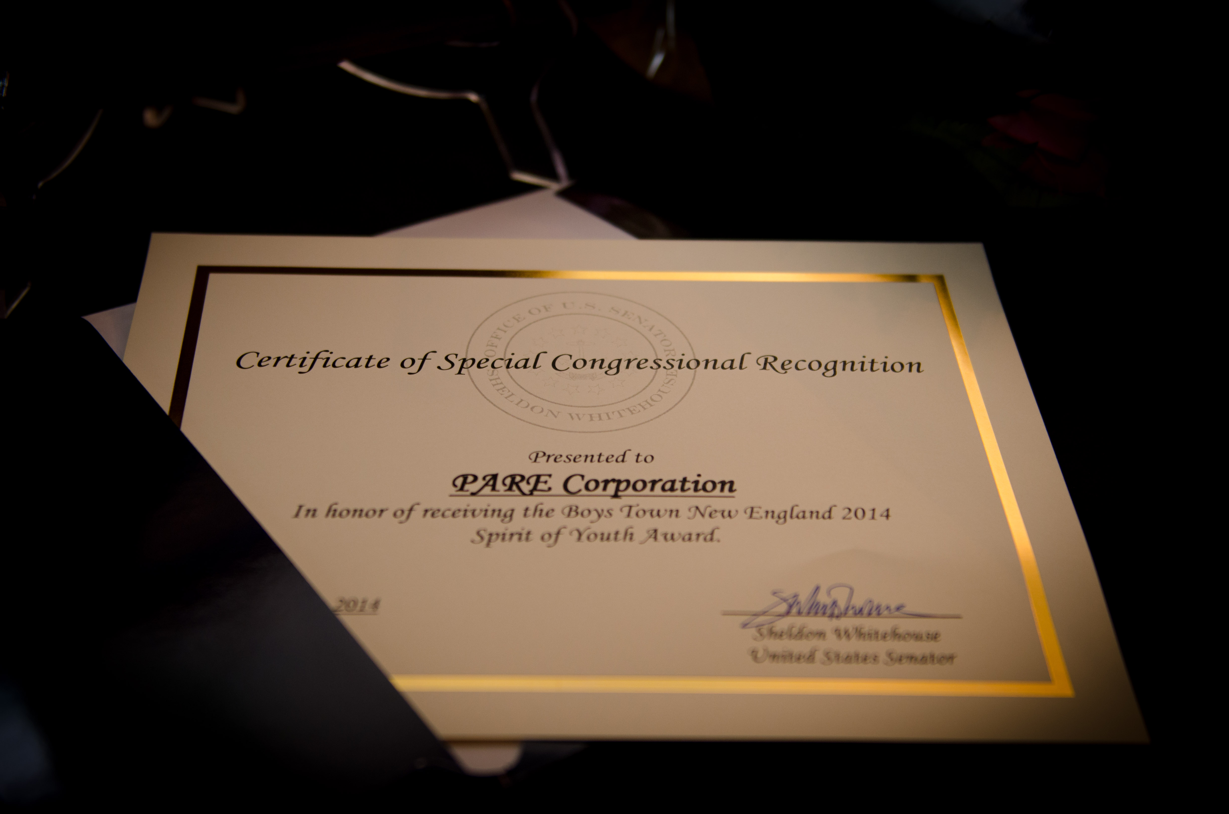 For 19 years, Pare Corporation has provided gifts to each child living with a Boys Town foster family during the holiday season. This year, Boys Town New England honored Pare with the 2014 “Spirit of Youth” award.