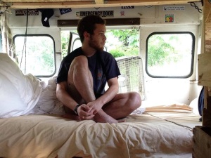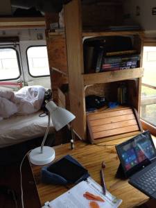 With no previous building experience, Jon spent the eight days of his spring break gutting and rebuilding his new space. He installed new floors and did some woodworking to build shelving, a desk, and create storage compartments. To maximize the ability of the bus to be self-sustaining, he mounted four solar panels to the roof that can generate 400 Watts. For those cloudy days, Jon has two 125 Amp-hour batteries so that he won’t be completely off the grid. Jon also has a propane tank and 10,000 Btu heater for when the temperature drops.