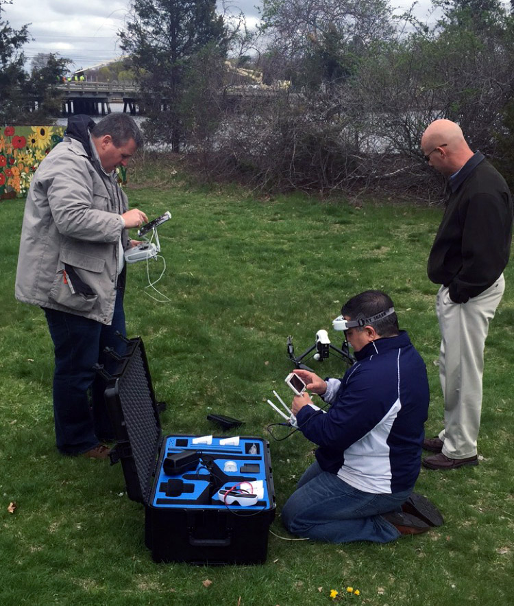 Sean McVeigh and Seth Fandetti prepare the Inspire1 drone and flying equipment for takeoff. You can view Central Bridge in the distance.