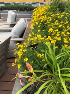 Up on a rooftop in the city, a garden in a planter attracts local wildlife, becoming a part of the local ecosystem.