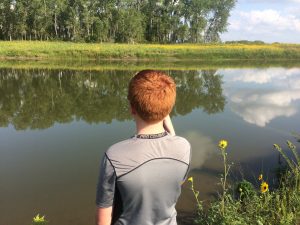 This photo includes a boy reflecting on the wonders of nature – the Missouri River – sustaining life for the fish, tadpoles, and snapping turtles within the muddy water, allowing wildflowers an opportunity to flourish along its banks in the shadows of a magnificent tree grove, and providing nourishment for millions and millions of acres of farmland just out of view.