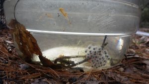 Vernal pools host an incredible amount of biodiversity. These wetlands, which dry up every summer, provide a nursery of sorts for a wide variety of species from wood frogs to dragonfly nymphs. Species in this photo include yellow spotted salamander eggs, fairy shrimp, water mites, and caddisfly larvae.