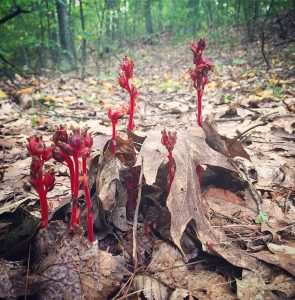 Most plants make their own food, but those lacking chlorophyll steal from their neighbors! Pinesap (Hypopitys monotropa) absorbs its nutrients from fungi in the soil.