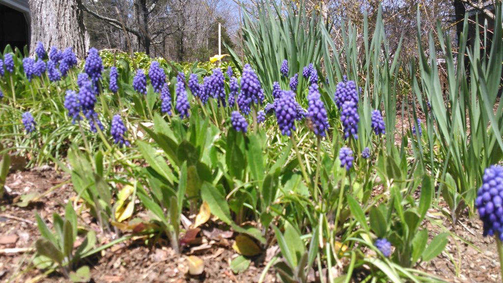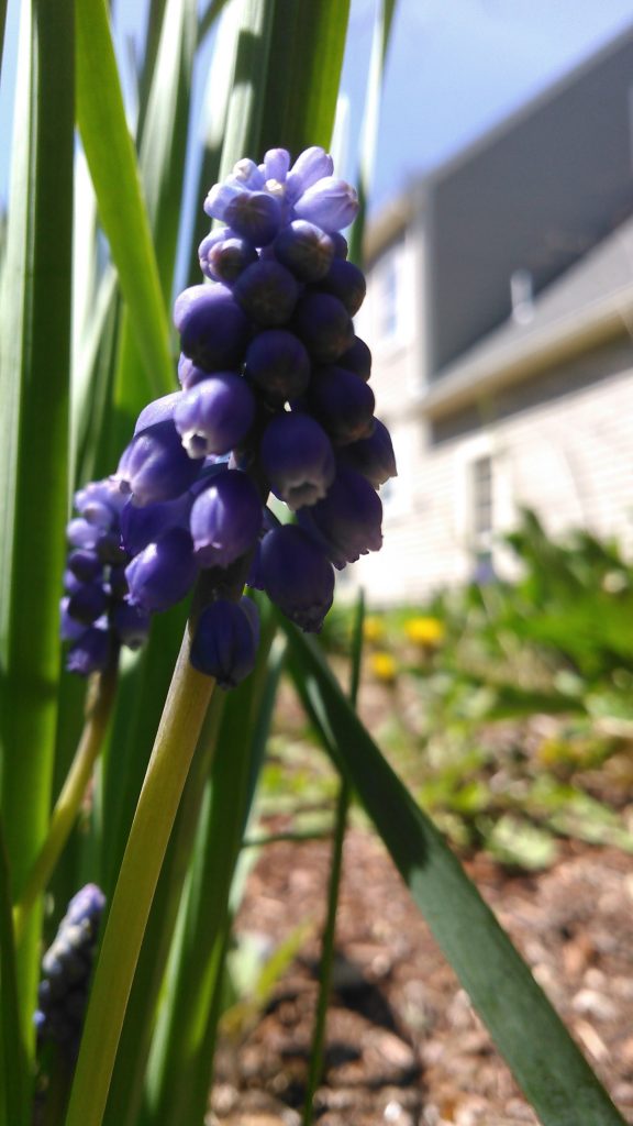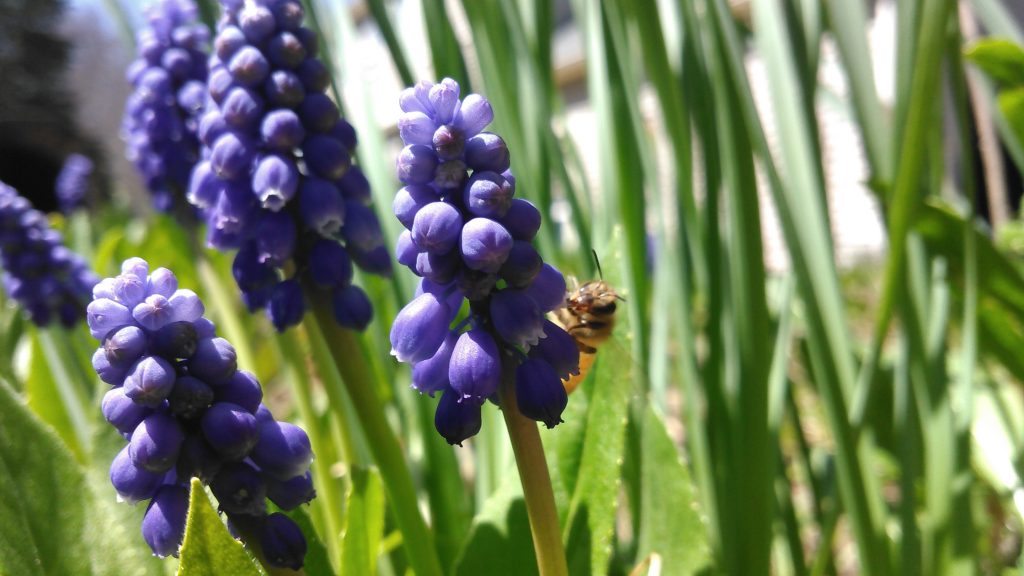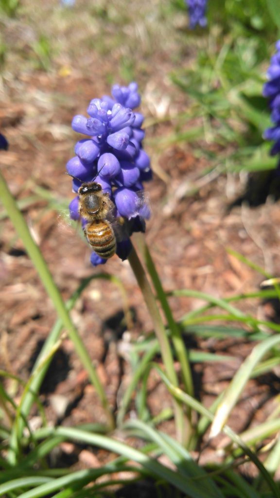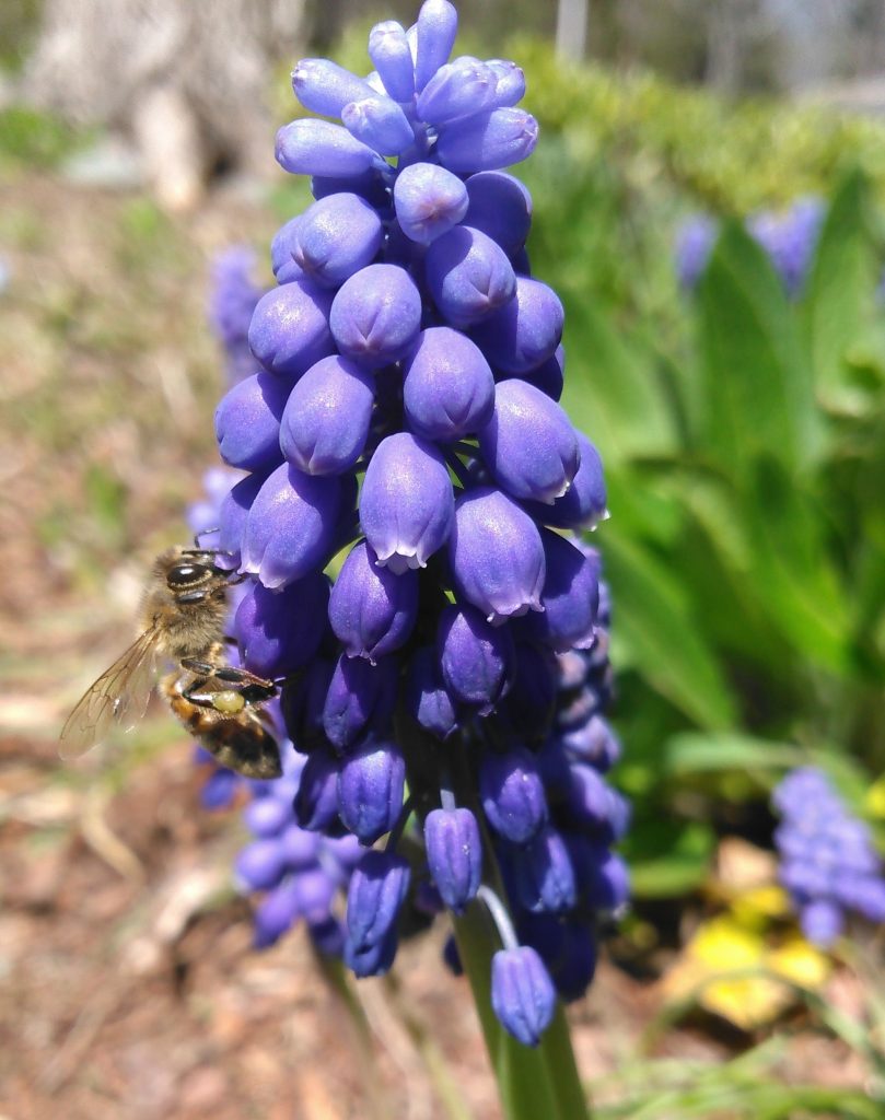 He commented, “These grape hyacinth were taking over and I decided to go out and remove a few to regain my garden. Instead I found myself in a prone position watching scores of honeybees hard at work. Live and let live.”